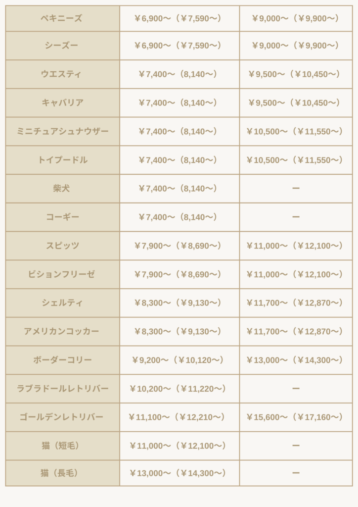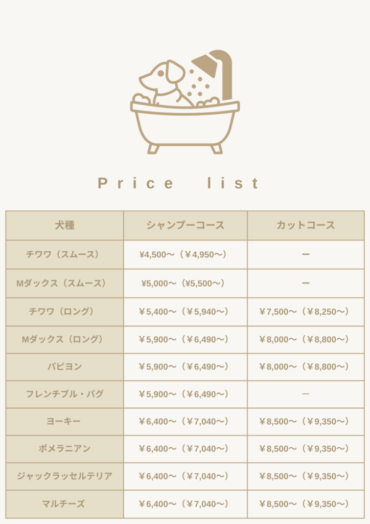 groomingsalonkulta ※()内の金額は税込価格です。 当店は完全予約制となっております。 記載のない犬種(MIXを含む)の料金はサロンまでお問い合わせください。 デザイン性や特殊性の高いカットは、追加料金を頂く場合がございます。 毛玉・もつれ・抜け毛がある場合追加料金を頂く場合がございます。 1年以内に接種した狂犬病・混合ワクチンの接種証明書のご提示が必要となります。